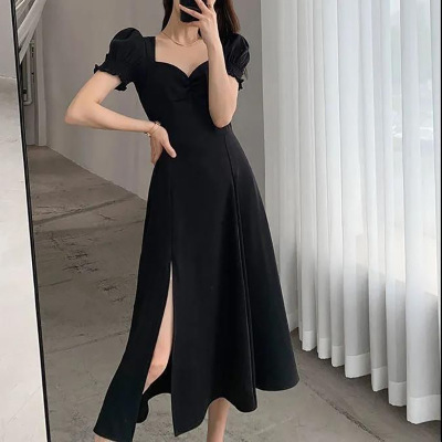 赫本风长裙气质方领复古法式泡泡袖a字夏季新款连衣裙开叉长裙子