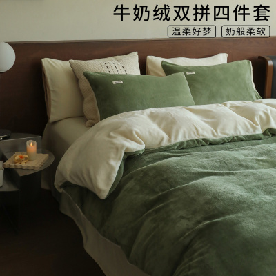 简约秋冬牛奶绒床上四件套加厚加绒双拼色被罩宿舍床单三件套床笠