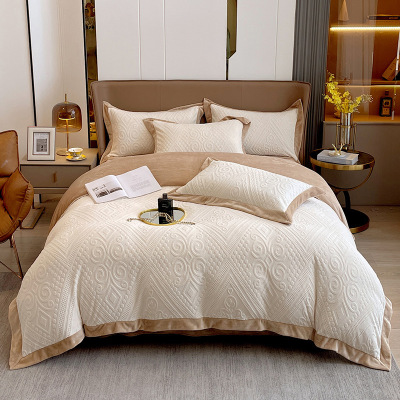 冬季简约轻奢保暖牛奶绒床盖款四件套纯色宽边刺绣加厚皮草绒床品