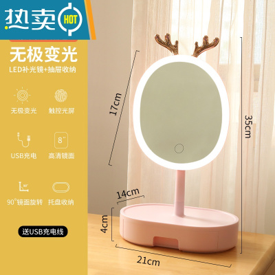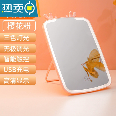 敬平led化妆镜鹿角台式桌面家用梳妆镜发光带灯办公室镜子少女心宿舍便携式用镜 三色灯[粉]+长按调节亮度
