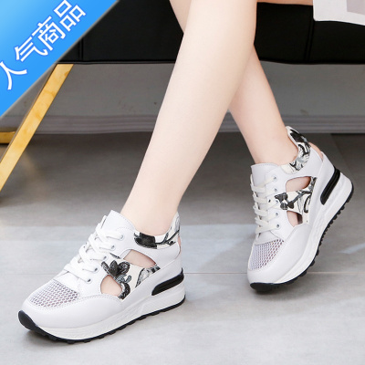 SUNTEK运动凉鞋女2023新款夏季小白鞋包头镂空透气网面厚底内增高老爹鞋