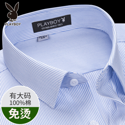 花花公子纯棉免烫条纹短袖衬衫男夏季新款商务正装男士大码白衬衣