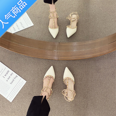 SUNTEK包头凉鞋女粗跟小众设计感2022年新款法式尖头铆钉中跟玛丽珍鞋女