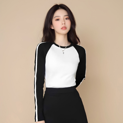 撞色复古插肩袖T恤女短上衣莫代尔春秋装美式辣妹长袖打底衫内搭