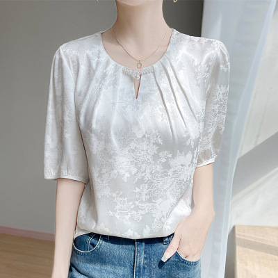 法式钉珠丝滑缎面短袖女夏季新款提花缎面上衣圆领泡泡袖T恤