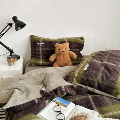 复古格纹仿羊毛绒拼牛奶绒四件套秋冬加厚高克重保暖珊瑚绒被套