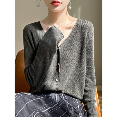 春夏新款精纺羊毛针织开衫女V领薄款宽松百搭长袖外套防晒空调衫