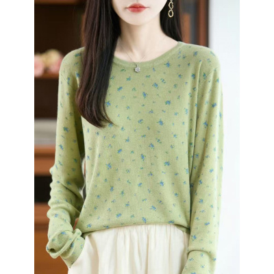 秋冬新款精纺羊毛别致碎花长袖针织衫女内搭打底衫宽松上衣服潮
