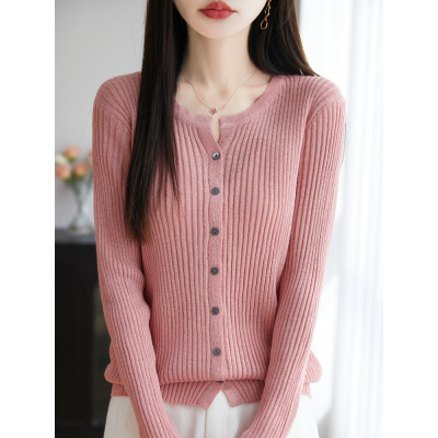 女V领针织开衫春秋新款精纺羊毛薄款外套蝴蝶结黑扣装饰宽松显瘦