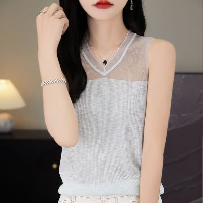 欧货无袖V领精纺羊毛针织背心女夏季新款网纱拼接微透内搭吊带潮