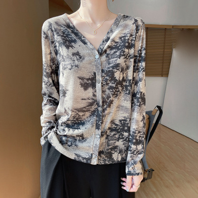 文艺水墨晕染针织衫女V领精纺天丝防晒长袖春秋叠穿内搭打底衫