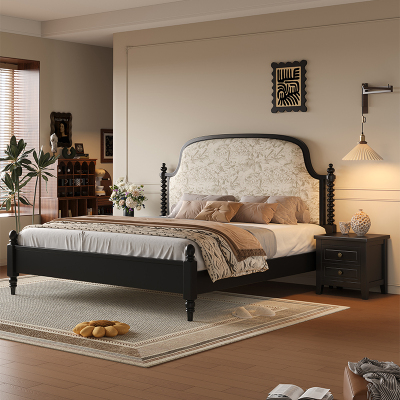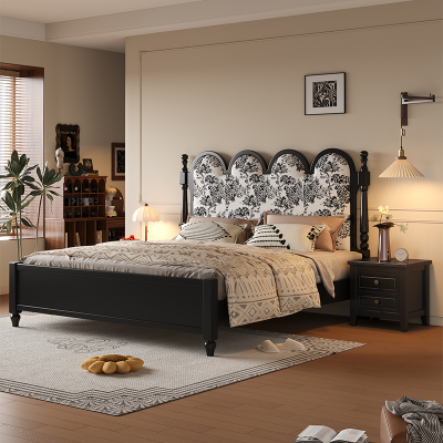 法式复古实木床1.8米主卧双人床美式软包床1.5米黑色中古风画屏床婚床
