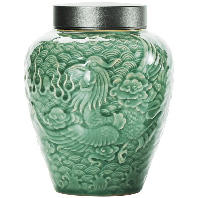 領藝 优选青瓷浮雕茶叶罐双层锡盖密封罐手工复古茶罐茶仓储物罐茶道配件 青瓷浮雕龙凤茶叶罐