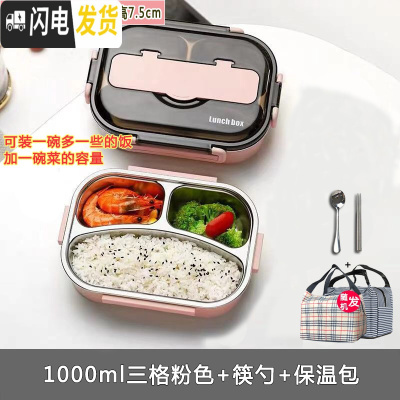 三维工匠304不绣钢保温密封男女学生便当餐盒塑料带盖分格成人上班族带饭 粉色三格1000+餐具+包饭盒/提锅