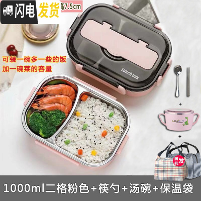 三维工匠304不绣钢保温密封男女学生便当餐盒塑料带盖分格成人上班族带饭 粉色二格1000+餐具+汤碗+包饭盒/提锅