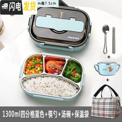三维工匠304不绣钢保温密封男女学生便当餐盒塑料带盖分格成人上班族带饭 蓝色四格1300+餐具+汤碗+包饭盒/提锅