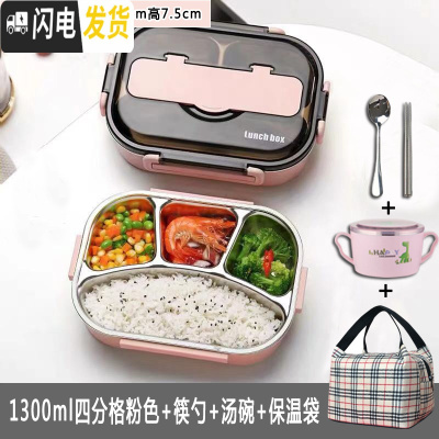 三维工匠304不绣钢保温密封男女学生便当餐盒塑料带盖分格成人上班族带饭 粉色四格1300+餐具+汤碗+包饭盒/提锅