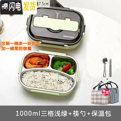 三维工匠304不绣钢保温密封男女学生便当餐盒塑料带盖分格成人上班族带饭 绿色三格1000+餐具+包饭盒/提锅