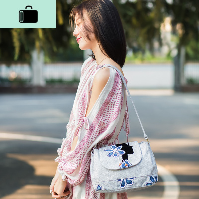 原创设计手工编织斜跨女包复古单肩布包民族风文艺范超轻大容量包NEW LAKE 浅灰色黑美人女斜挎包