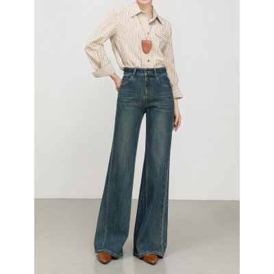 秋季新款四面弹牛仔喇叭裤女复古高腰宽松拖地筒喇裤