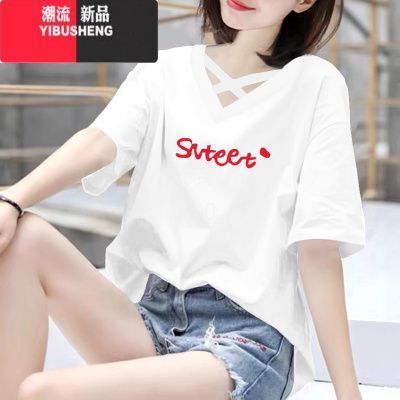 YIBUSHENG短袖t恤女士季新款胭脂粉韩版大码宽松百搭设计感v领上衣服