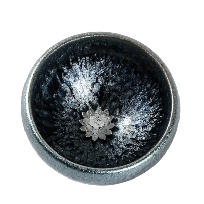 金镶玉 茶杯 建盏杯主人杯窑变盏陶瓷杯镶银雨滴盏品茗杯 银花盏