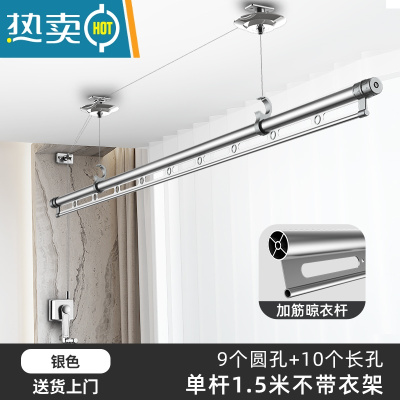 敬平手摇升降晾衣架单杆式小阳台晒被杆室内晾衣架小户型双杆 银色单杆1.5米无衣架 大晾衣杆