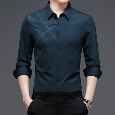 春秋款长袖衬衫男中年爸爸装合体衬衣休闲商务印花条纹衬衫