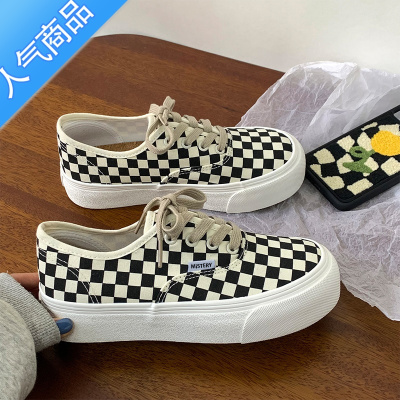 SUNTEK厚底棋盘格子鞋女2023夏季新款一脚蹬增高帆布鞋子女ins百搭板鞋