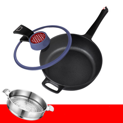 麦饭石不粘锅炒锅无油烟平底锅家用炒菜锅无涂层电磁炉燃气灶适用F2045碳纤维煎炒锅28CM(净味款)+不锈钢带耳蒸笼