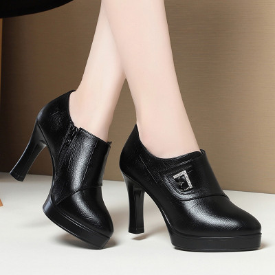 深口单鞋女春秋新款高跟鞋细跟加绒防水台厚底不累脚中年女士皮鞋