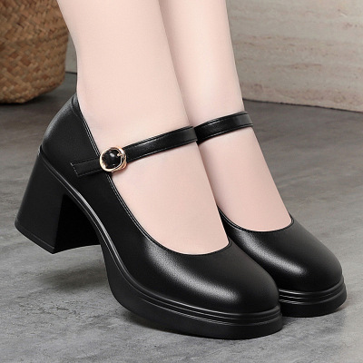 旗袍走秀鞋女中跟细跟防水台工作鞋一字扣黑色职业单鞋女皮鞋采有