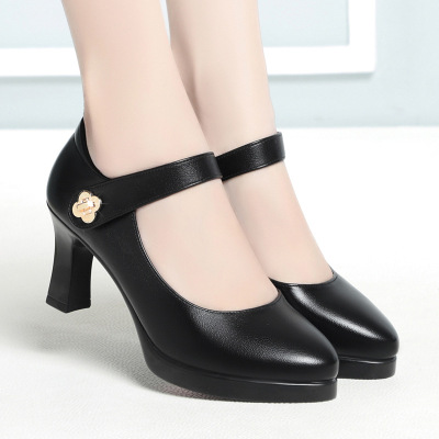 新款秋季软皮尖头不磨脚软面厚底工作职业女鞋黑色低跟女单鞋