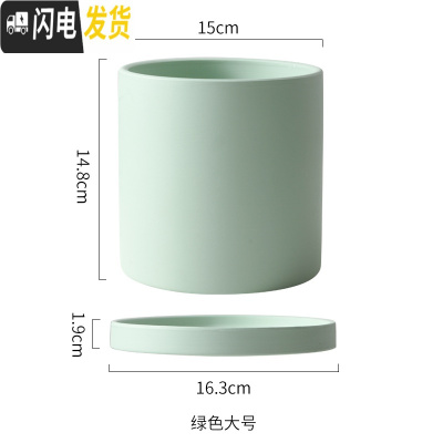 三维工匠陶瓷花盆直筒圆柱形 北欧ins多肉绿植鲜花绿萝盆栽带托盘 青色圆绿色15cm 中等花盆容器