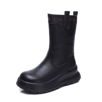 头层牛皮中筒高靴冬季新款真皮手工复古圆头厚底侧拉链女靴子