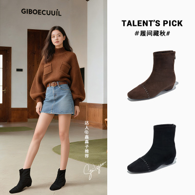 法式复古短靴女新款冬季粗跟马丁靴小众绒面瘦瘦靴休闲靴子女