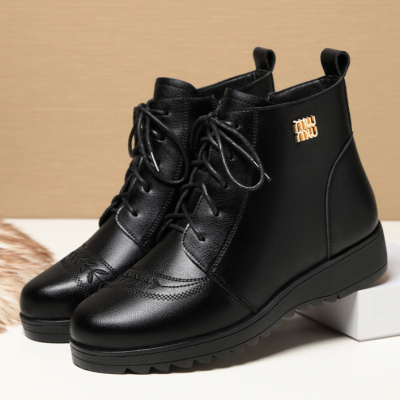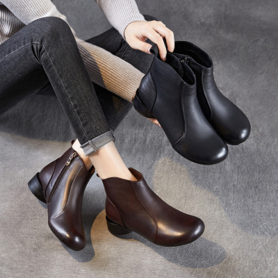 头层牛皮粗跟复古短靴女秋季新款妈妈鞋单靴真皮百搭时装靴子