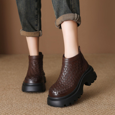 头层牛皮厚底短靴女秋冬新款真皮复古编织靴子休闲高帮鞋单靴