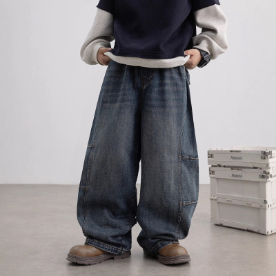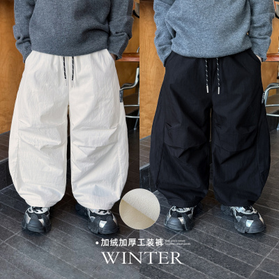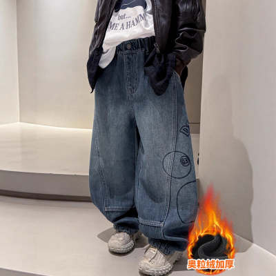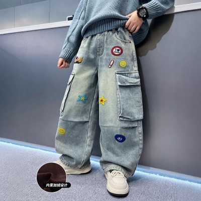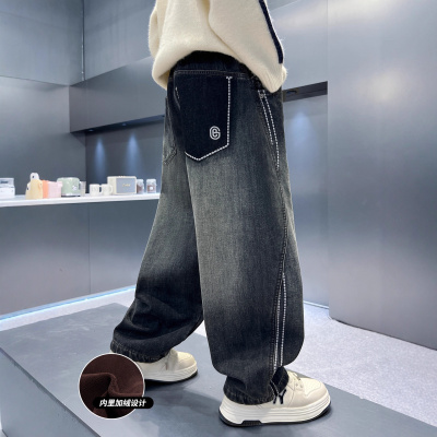 男童加绒牛仔裤新款中大儿童加厚冬装长裤秋冬阔腿工装裤子潮