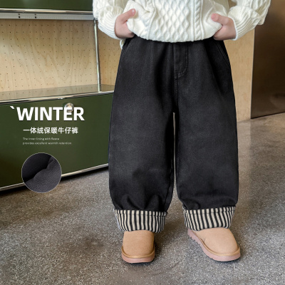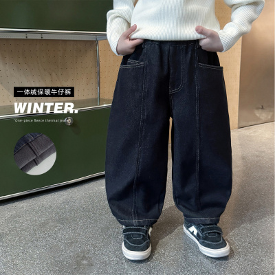 男童加绒牛仔裤秋冬款新款儿童冬季一体绒加厚裤子大男孩冬装