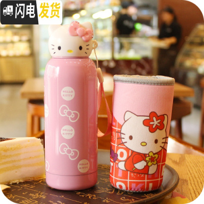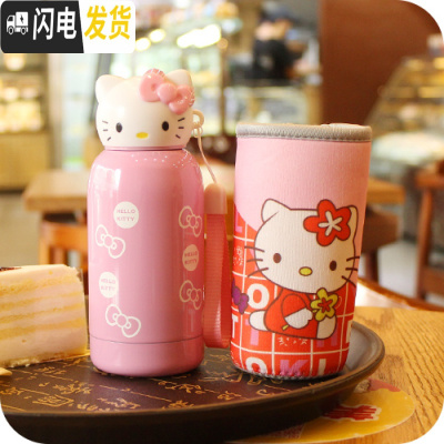 三维工匠韩国创意可爱卡通猫头保温杯不锈钢便携女学生儿童水杯水壶 280粉色+杯套