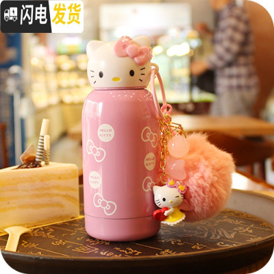 三维工匠韩国创意可爱卡通猫头保温杯不锈钢便携女学生儿童水杯水壶 200粉色+毛球