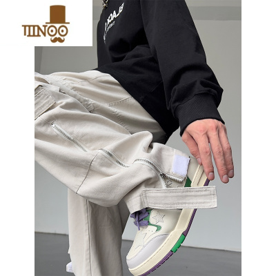 YANXU日系直筒工装裤子男款秋季高街宽松潮牌阔腿裤卡其色休闲长裤男士