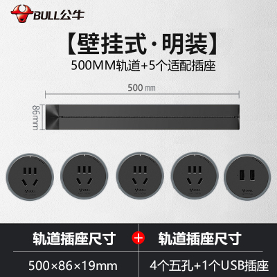 公牛(bull)0.5米黑色轨道+5插孔可移动电力轨道插座厨房专用无线滑轨接线板家用插排插座