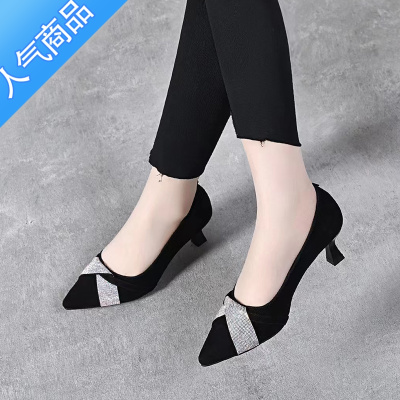 SUNTEK2023春秋新款水钻尖头浅口单鞋百搭名媛高跟鞋小跟磨砂女皮鞋