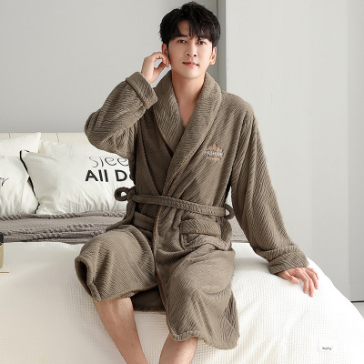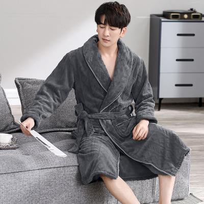 男士睡袍睡衣加绒加厚冬季珊瑚绒保暖浴袍男秋冬长款法兰绒家居服