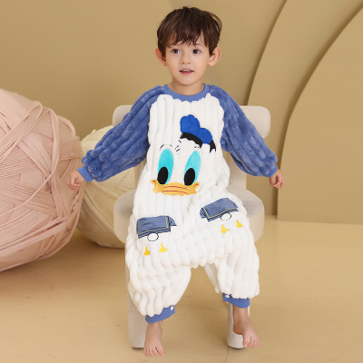秋冬儿童法兰绒分腿睡袋加绒加厚男童珊瑚绒睡衣连体衣保暖家居服