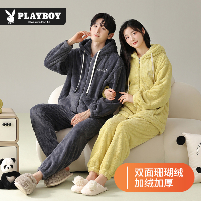 花花公子情侣款睡衣珊瑚绒男士秋冬季女加绒保暖可外穿纯色家居服