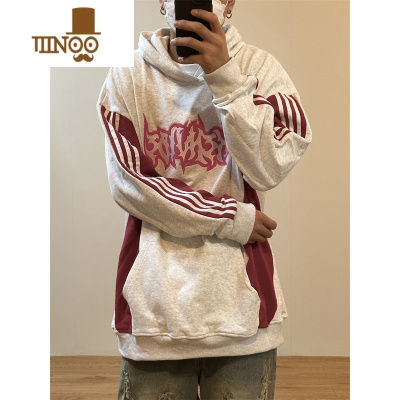 YANXU美式复古条纹拼接百搭情侣连帽卫衣男女同款字母刺绣宽松帽衫