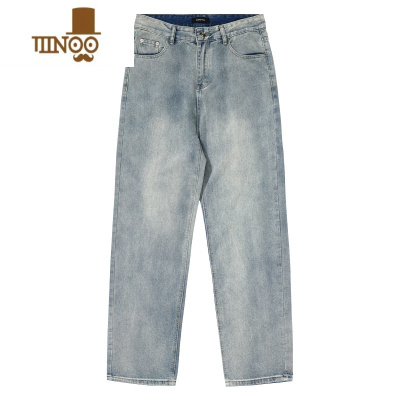 YANXU秋季百搭浅蓝色水洗做旧牛仔长裤男女款宽松直筒美式复古休闲裤子
